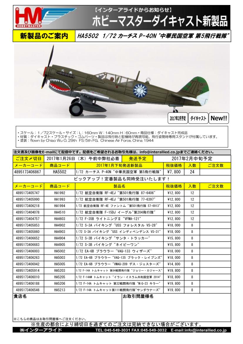 販売店様向けご案内 弊社取り扱いHOBBY MASTER 2017年2月発売予定追加新製品の販売店様/一次問屋様向けご案内書(JPG)です。