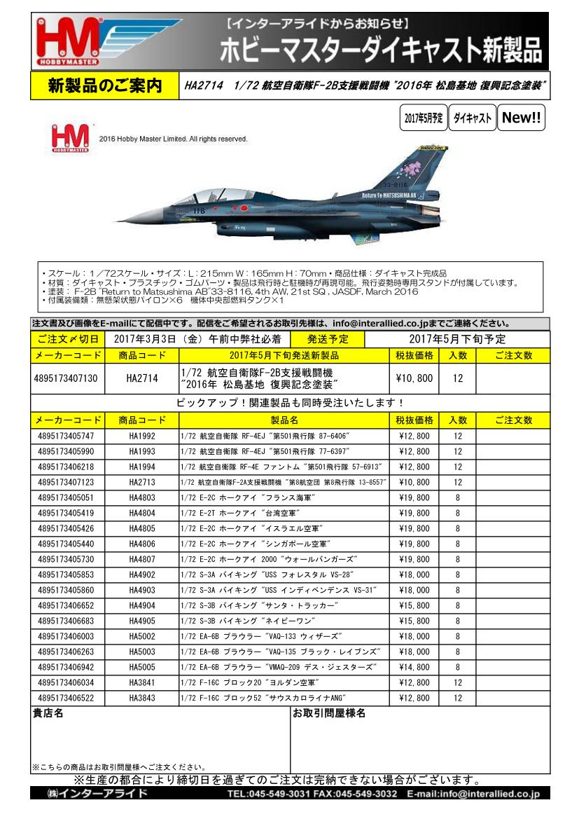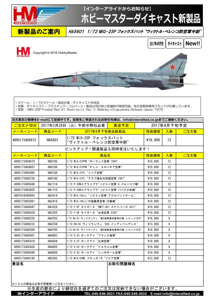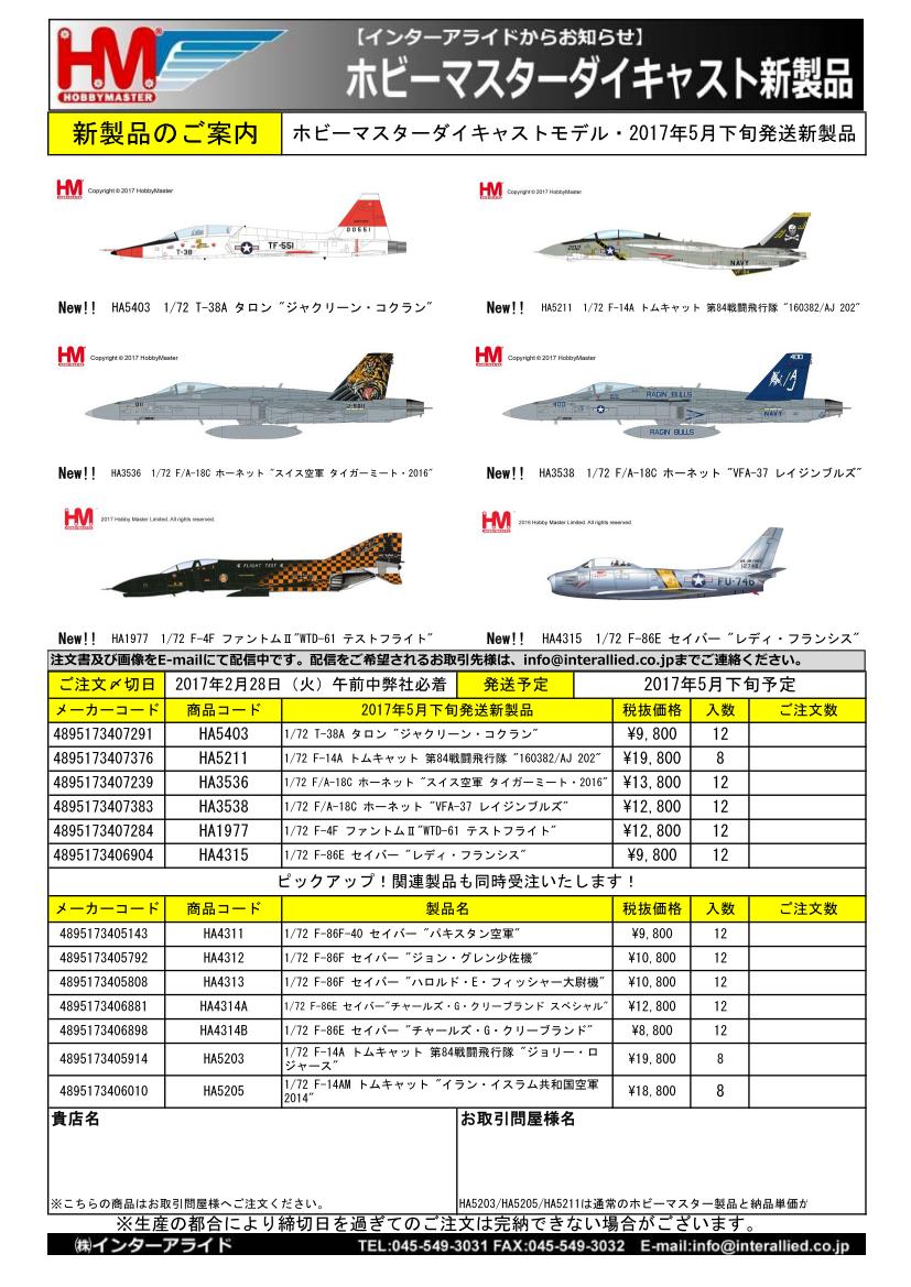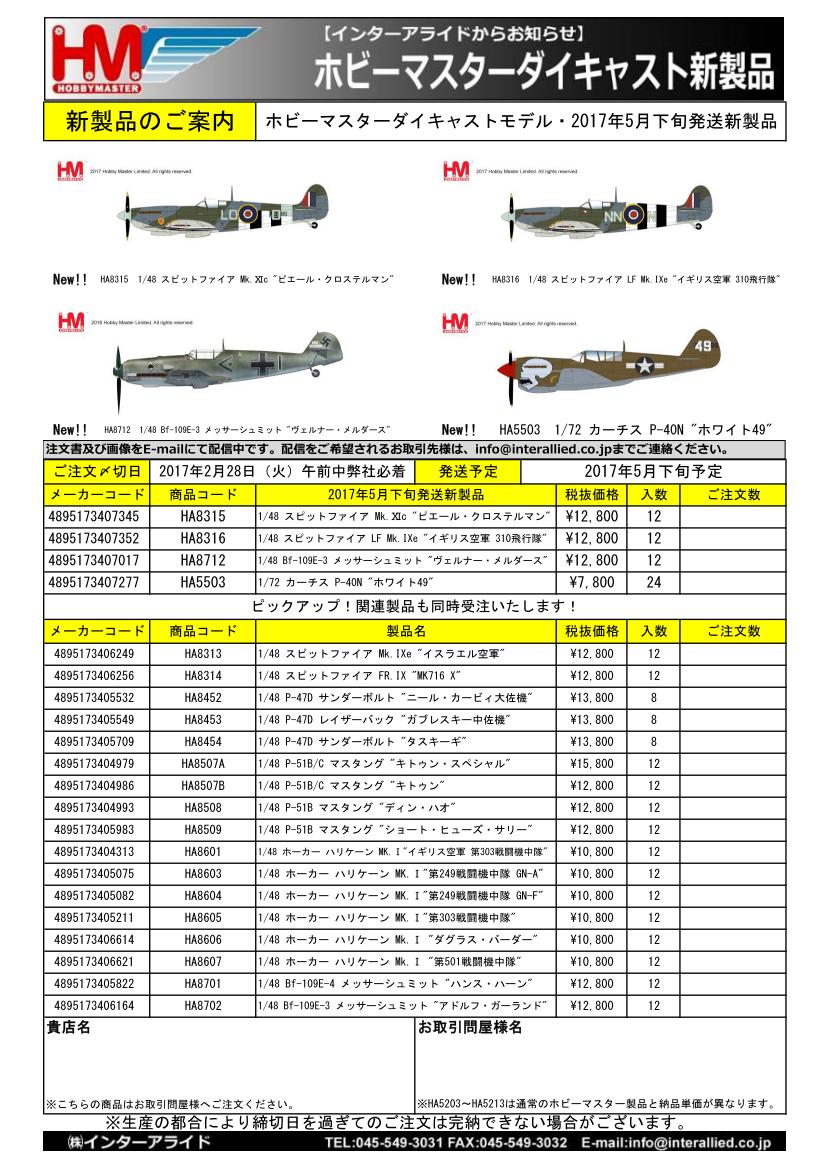 販売店様向けご案内 弊社取り扱いHOBBY MASTER 2017年4月発売予定追加新製品・5月発売予定新製品のご案内書(JPG)です。
