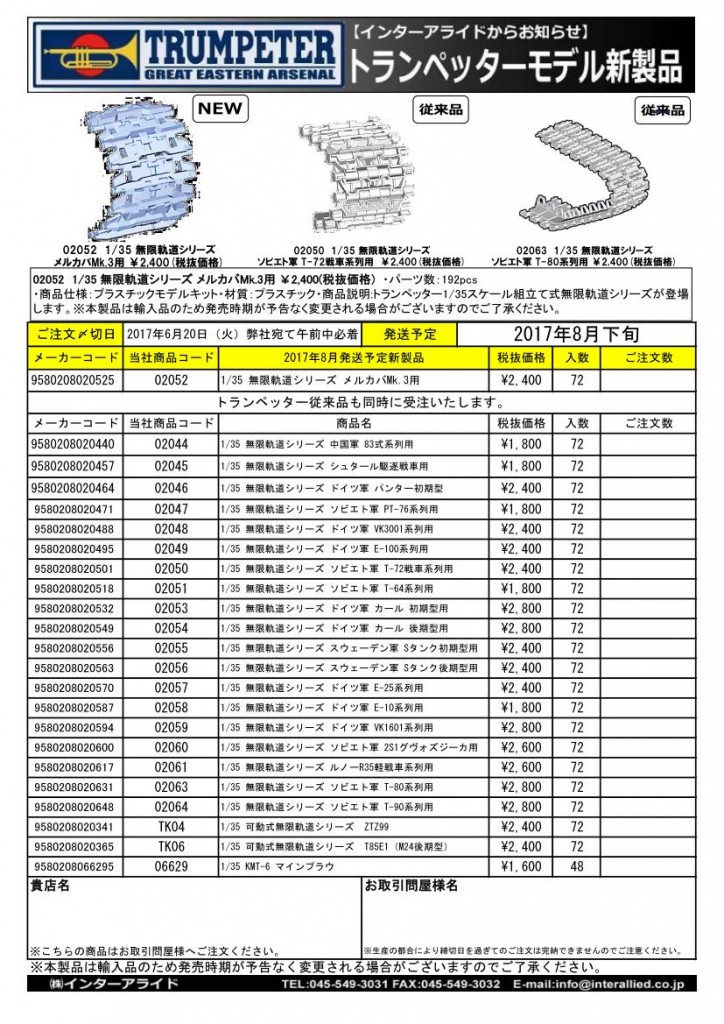 弊社取り扱いトランペッタープラスチックモデル2017年8月発売予定の新製品をご案内します。