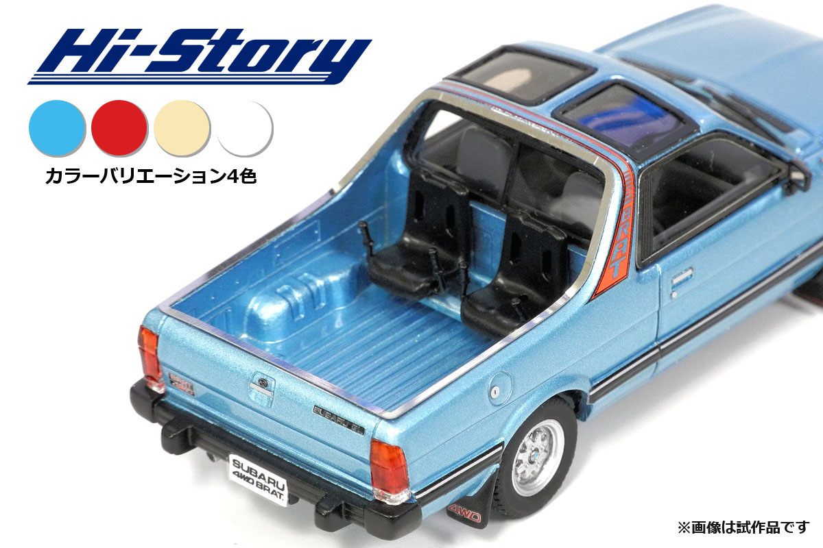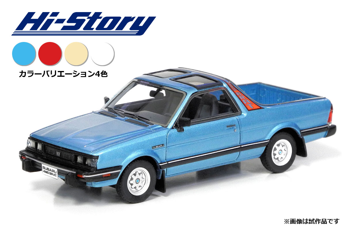産していた輸出専用車、スバル・ブラットが登場します。日本国内にも少数が逆輸入され、そのスタイルと希少性の高さから人気車種となっています。製品は、2代目レオーネをベースとした1984年モデルを再現。Tバールーフと特異なフォルムを1/43レジンキャストモデルで立体化しています。