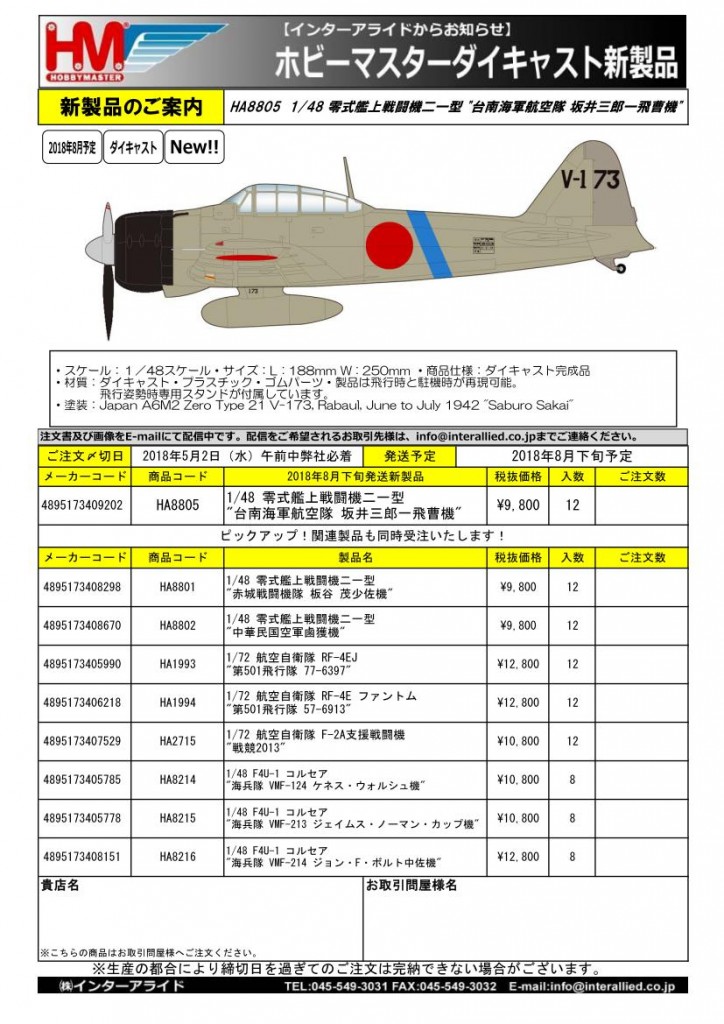 HA8805 1/48 零式艦上戦闘機二一型 “台南海軍航空隊 坂井三郎一飛曹機” ¥9,800(税抜価格)