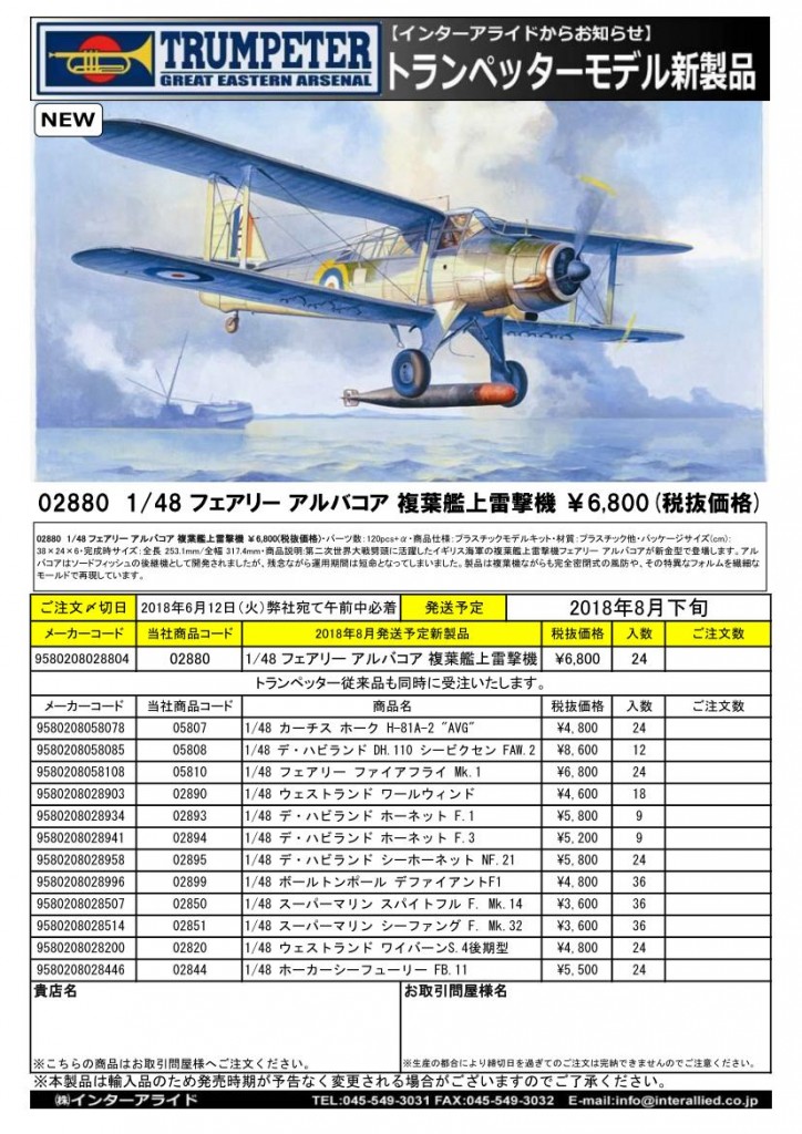 02880 1/48 フェアリー アルバコア 複葉艦上雷撃機 ¥6,800(税抜価格)