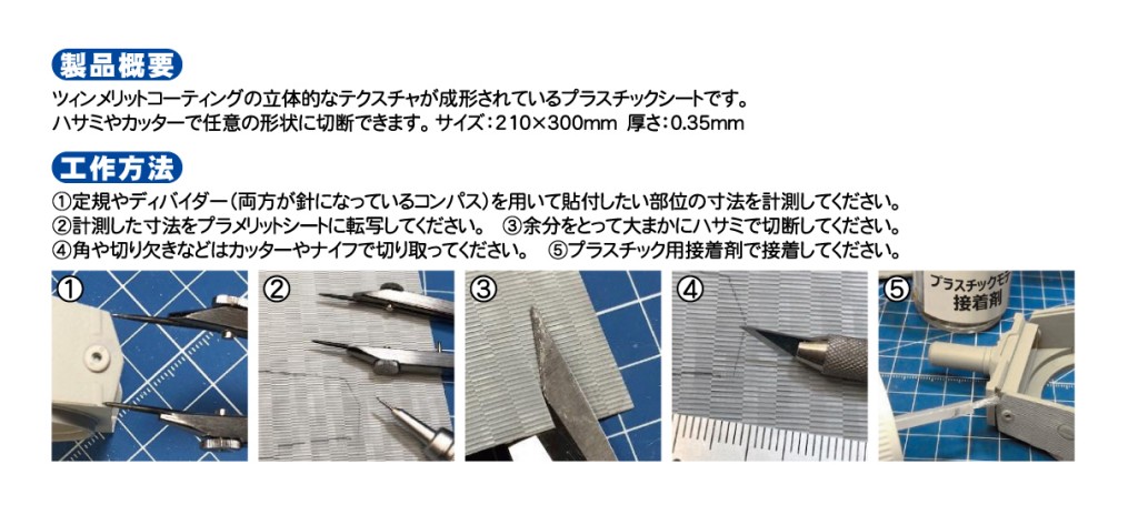 製品概要 ツインメリットコーティングの立体的なテクスチャが成形されているプラスチックシートです。 ハサミやカッターで任意の形状に切断できます。サイズ:210×300mm 厚さ:0.35mm