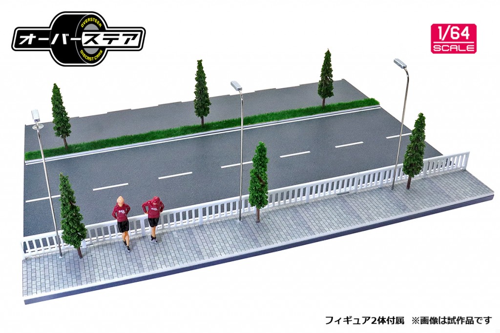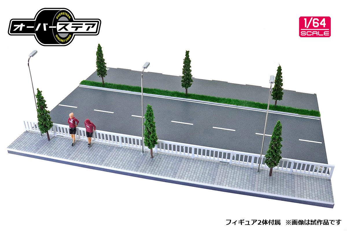 分離帯や街路樹、街路灯とフェンスやフィギュア等を配置して完成となります。