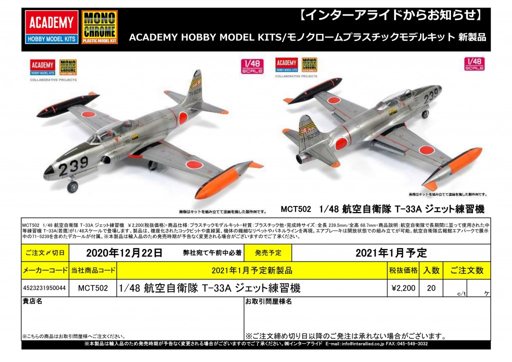 MCT502 1/48 航空自衛隊 T-33A ジェット練習機 ¥2,200(税抜価格)