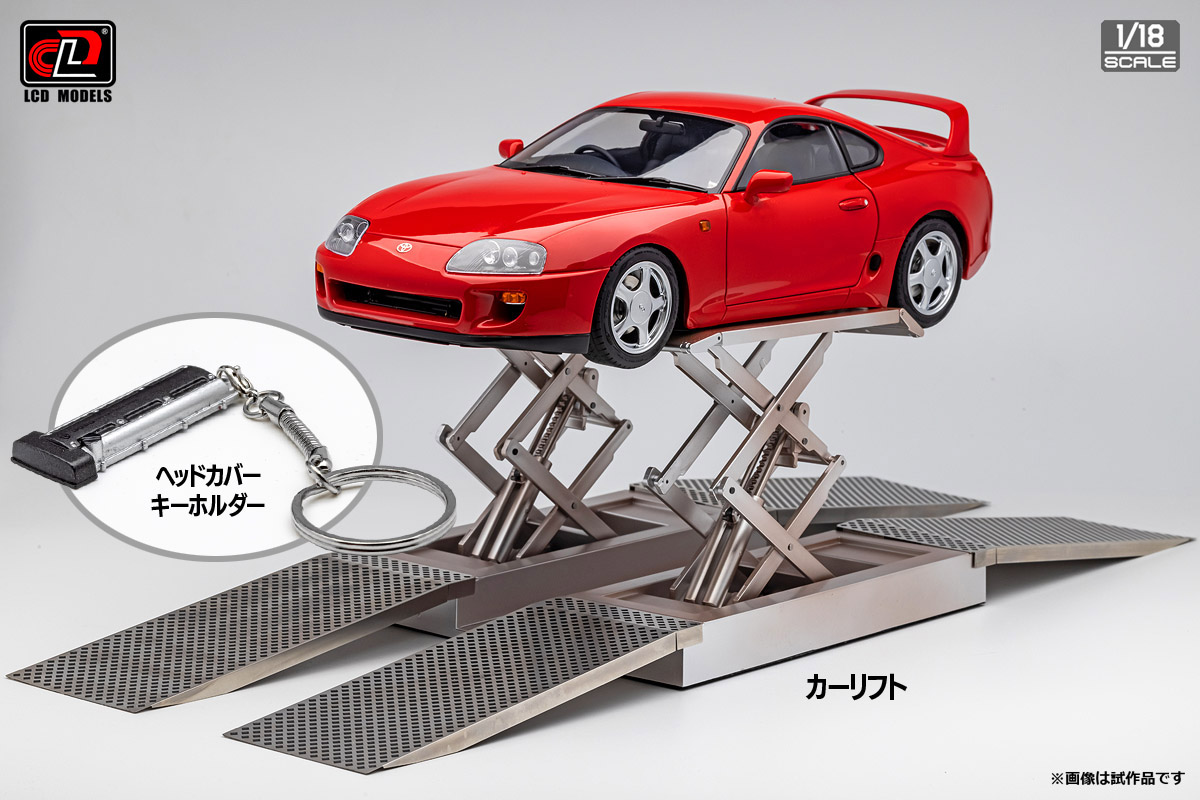 可動式カーリフトと2JZ系エンジンヘッドカバーキーホルダーが付属しています。