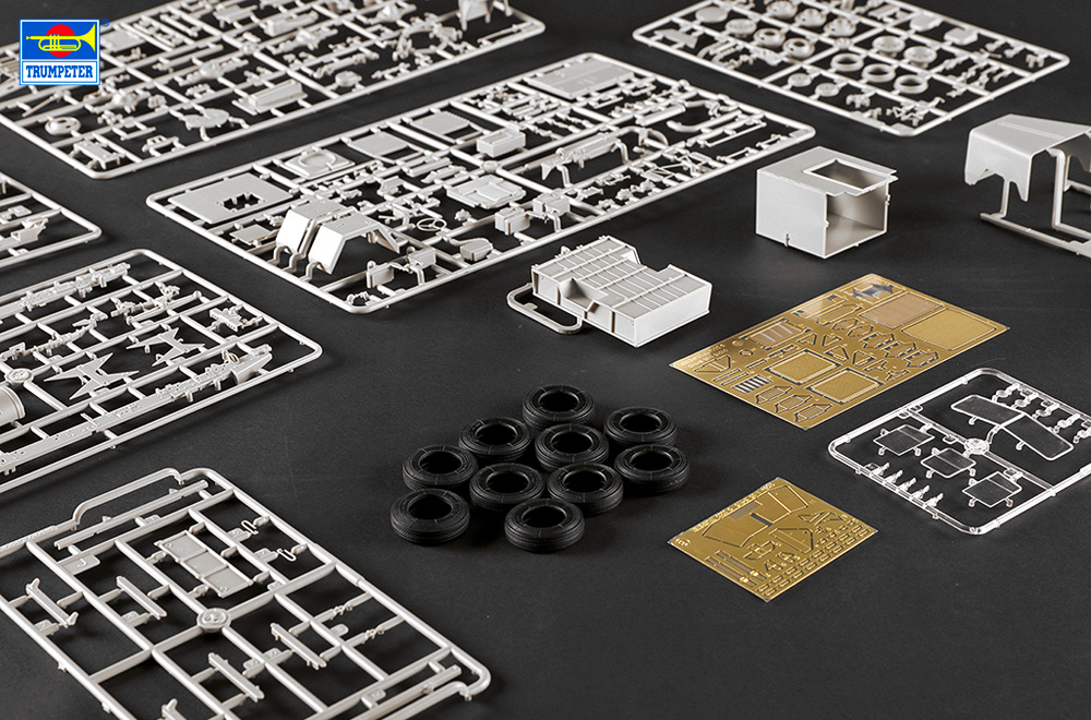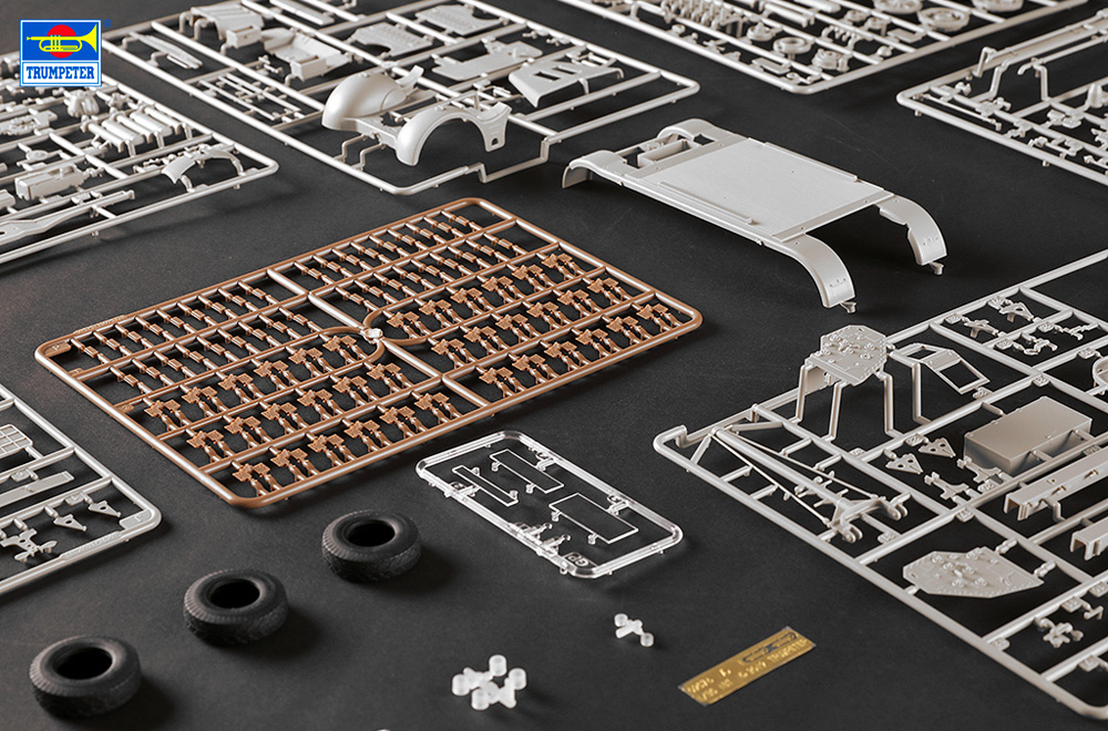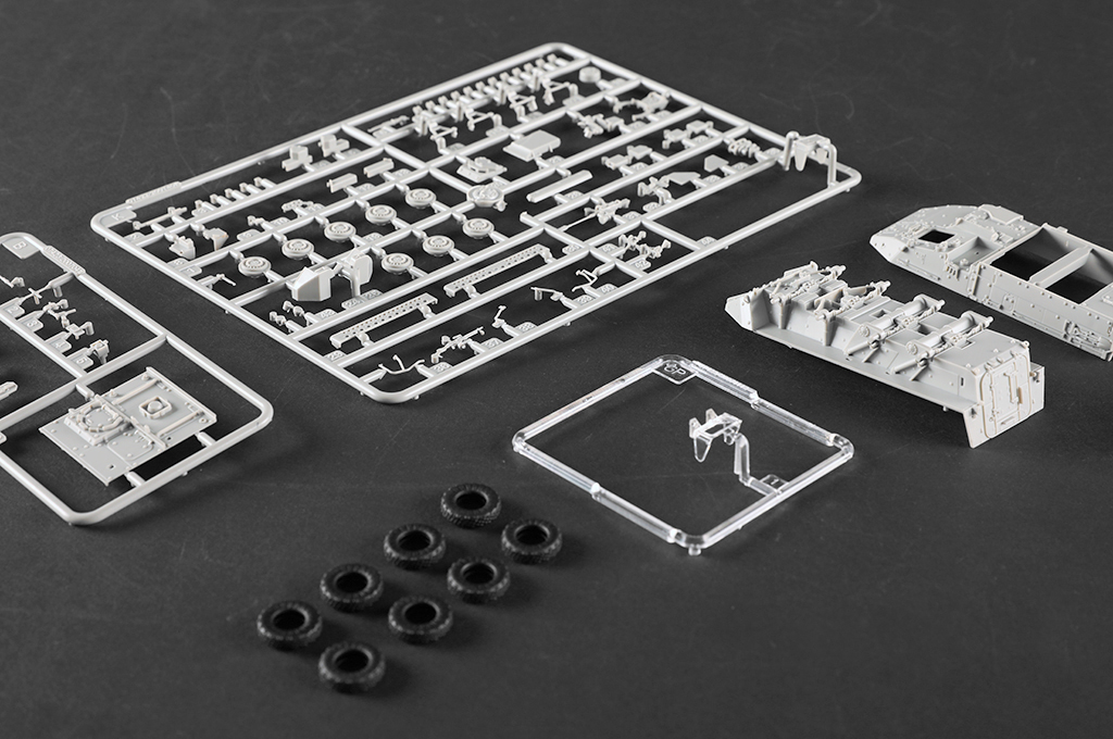 履帯は分割組み立て式、タイヤはゴム系樹脂製。ドイツ陸軍デカール2種、運転席窓用マスキングステッカー付属。