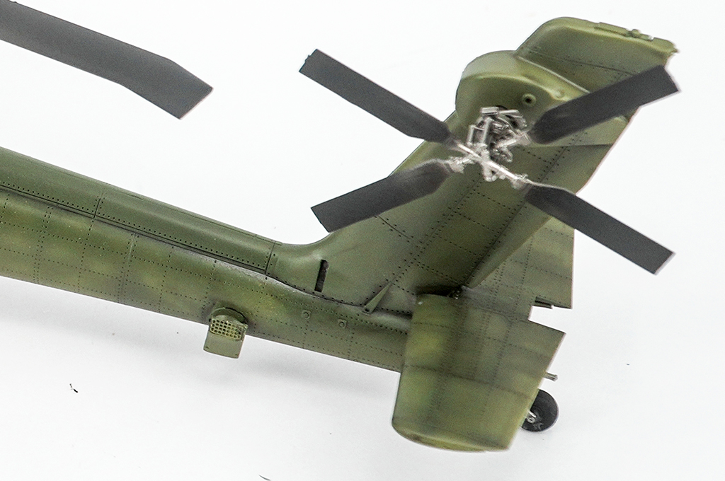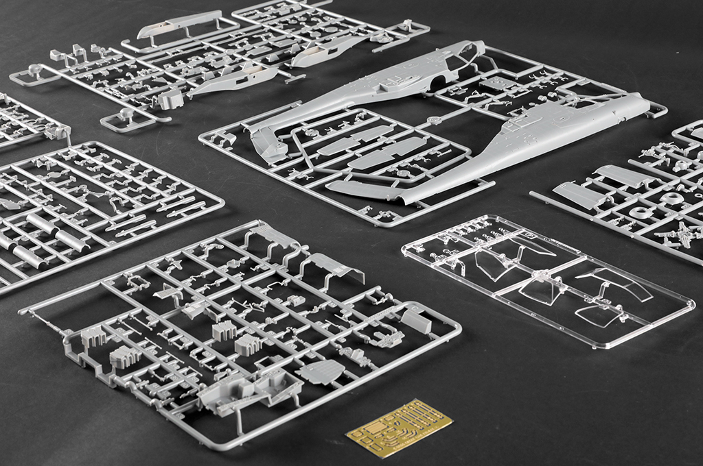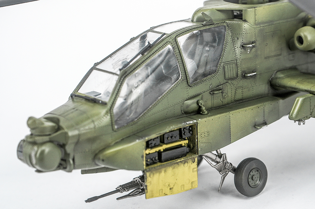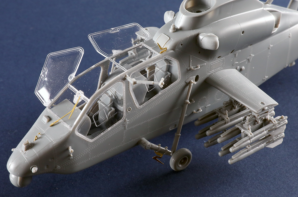 製品は精密なモールドで機体のモールドやパネルライン、各種兵装(機首下グレネードランチャー/ロケット弾ポッド/20mm機関砲/12.7mm重機関銃)と機体内部やエンジンを精密再現。