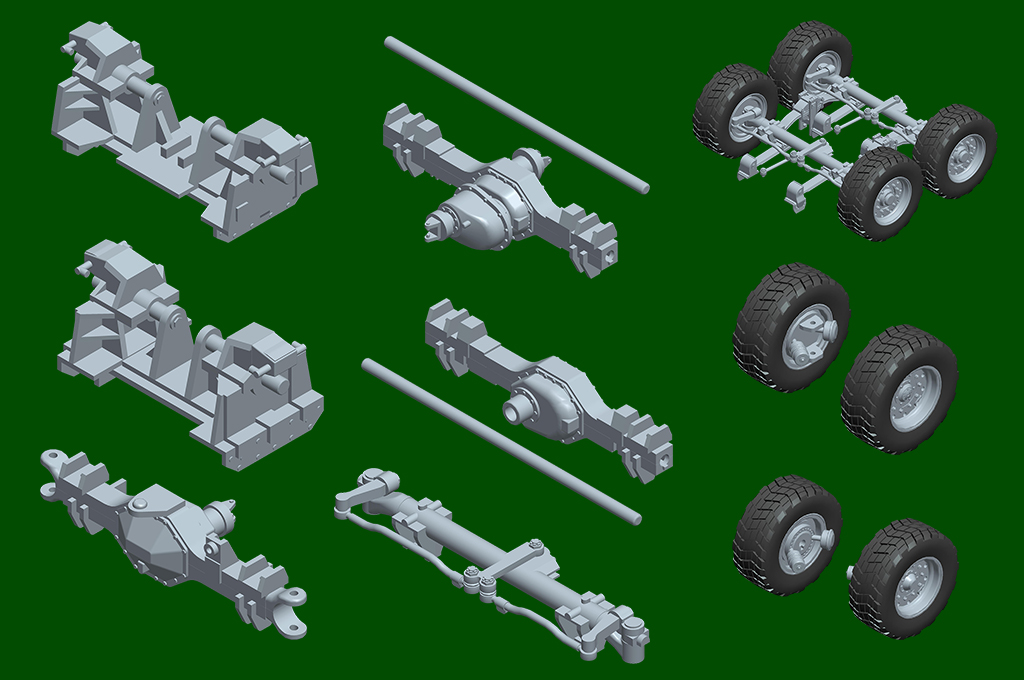 製品はスライド金型で成形されたキャビン、装輪車両特有の足回り(トランスミッション・サスペンション等、52tセミトレーラーを精密なモールドで再現。