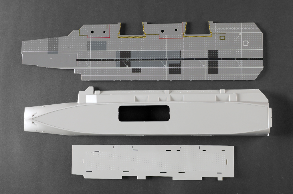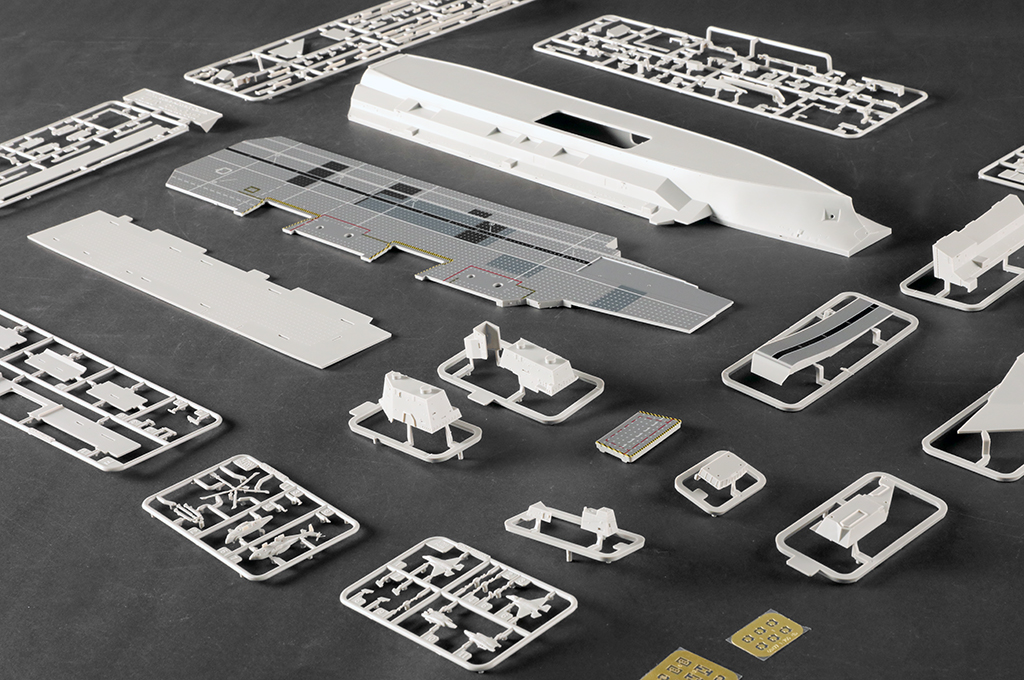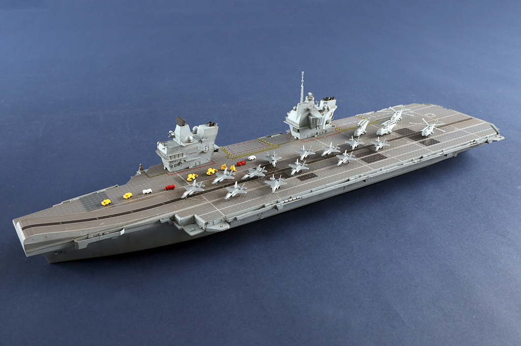 製品は2つに分割された艦橋(アイランド)や飛行甲板や航空機格納庫や船体、艦載航空機(F-35×6機・EH-101汎用ヘリコプター×6機)と各種作業車等を精密なモールドで再現しています。