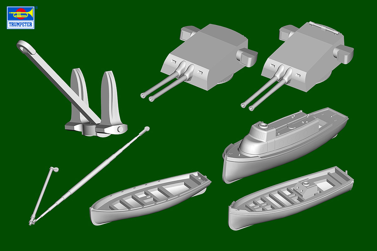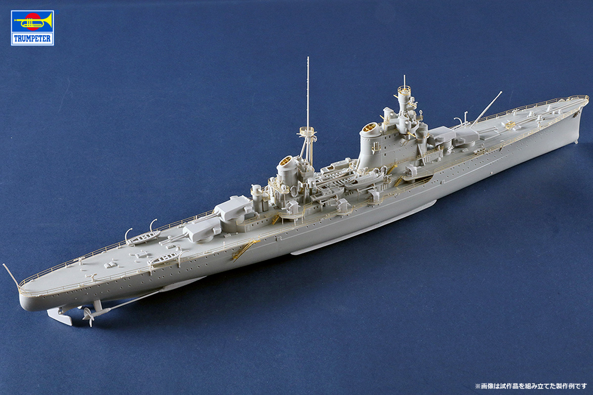 製品はスライド金型で成形された船体(フルハル)や各種上部構造物、主兵装である20.3cm連装砲塔と各高角砲や機関砲を精密なモールドで再現しています。